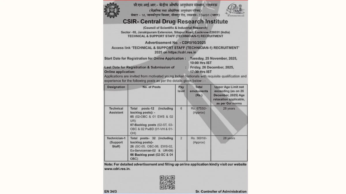 CSIR CDRI Recruitment 2025: केंद्रीय औषधि अनुसंधान संस्थान में निकली टेक्नीशियन और टेक्निकल असिस्टेंट के 44 पदों के लिए भर्ती, ऑनलाइन आवेदन करें